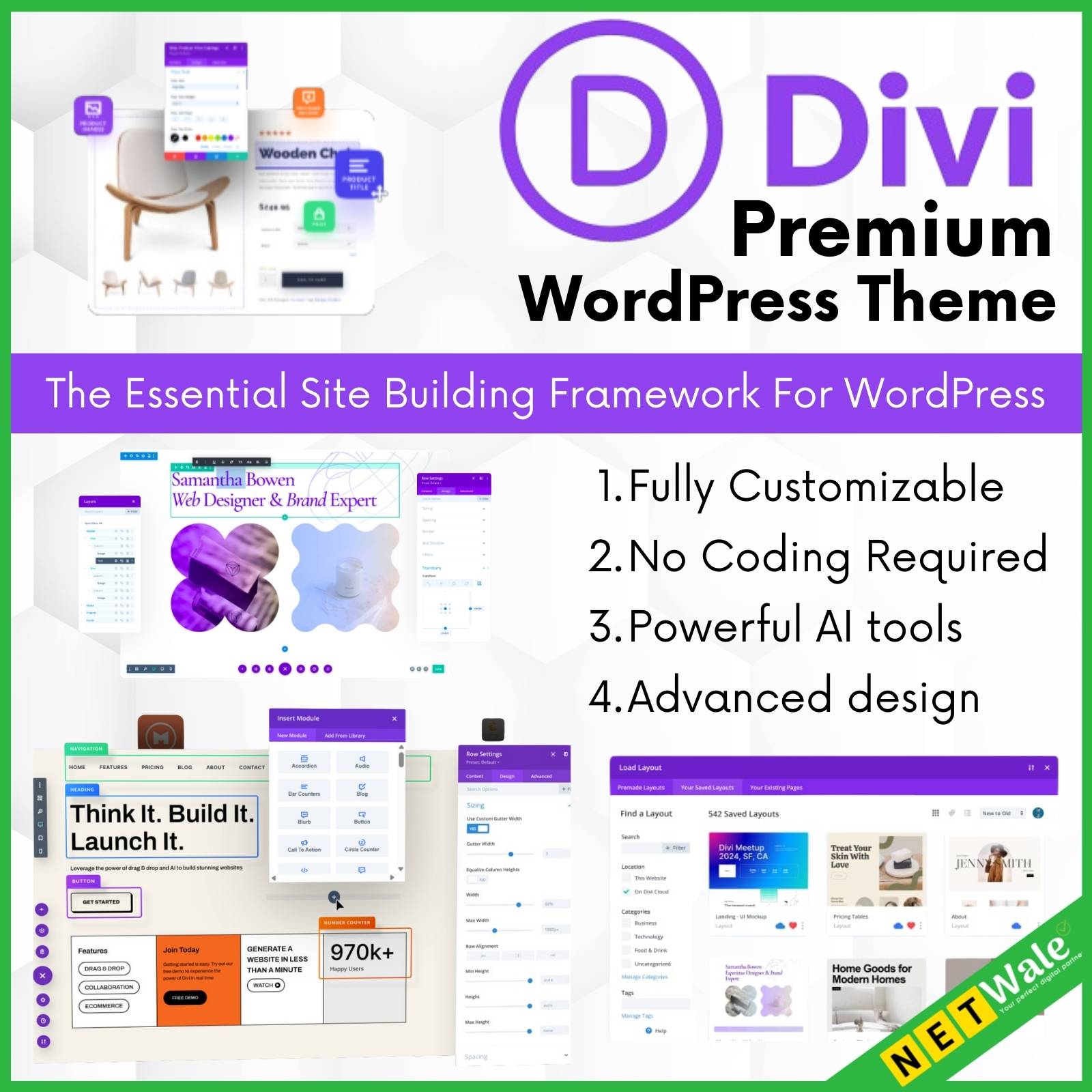 Choose a premium starter site with pre-designed pages, theme templates, hundreds of module presets, and global styles for visual consistency. Generate an entire website in less than a minute, then jump into Divi to easily customize everything.